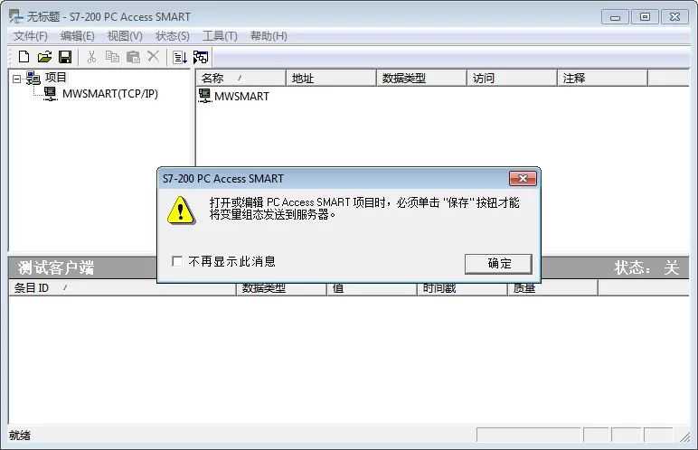 第一次打开S7-200PCAccessSMART软件,会随软件同时出现一个提示窗口,其内容是告知使用者,在进行OPC通信之前,对S7-200PCAccessSMART项目进行保存。
