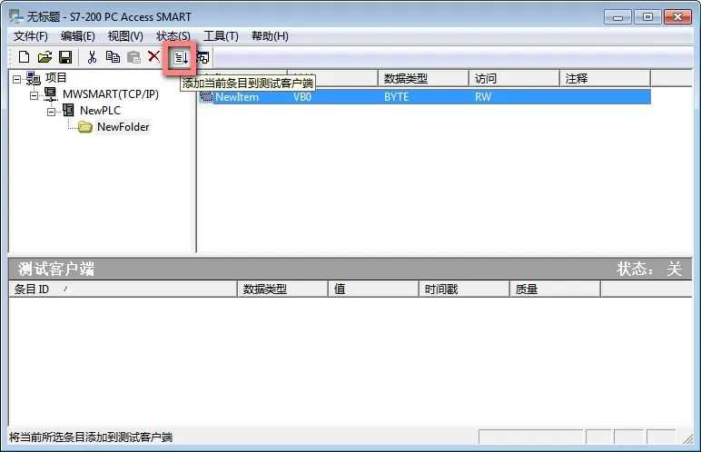 注意:客户端测试只能测试从PLC读取变量数值,不能测试向PLC写变量值