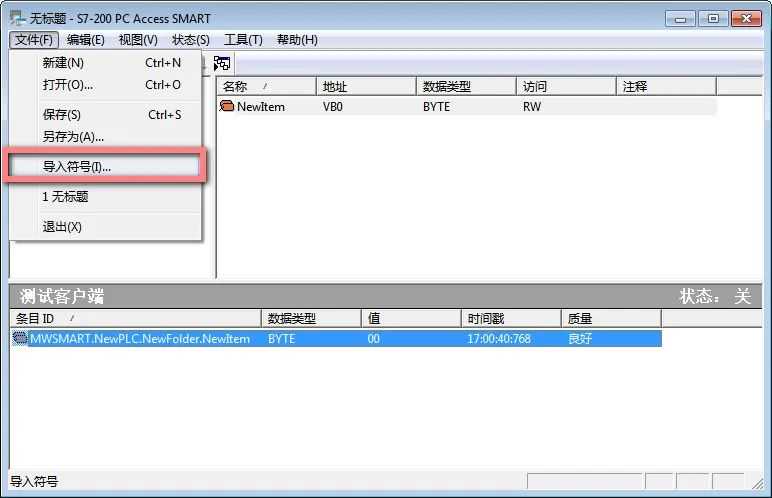 首先需要使用者的S7-200SMART程序中变量有符号名,选择S7-200PCAccessSMART软件---文件---导入符号,就可以找到S7-200SMART程序,把S7-200SMARTPLC中有符号名的变量都导入到PCAccessSMART中。