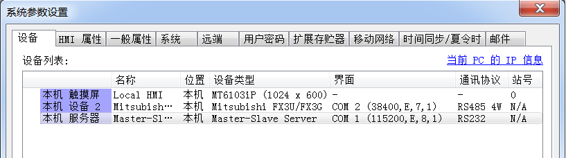 2.MasterSlaveServer驱动下的COM口参数为"115200,E,8,1",这个参数没有要求一定要和PLC驱动的参数一致,但限定数据位必须为8.另外,尽可能设定为较快的波特率,这样从屏可以较有效率的读取到PLC的数据。