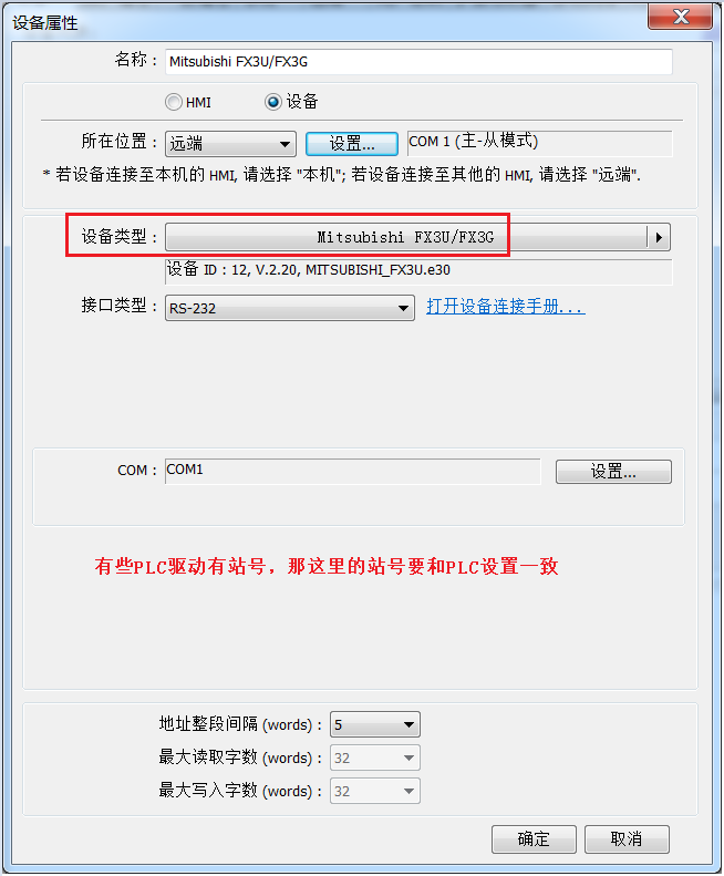 1.在设备列表中建立一个新的设备,"设备类型"选择"MitsubishiFX3U/FX3G",有"PLC预设站号"参数的,要与PLC所使用的站号相同。