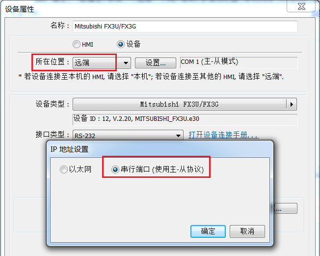 3.因为从屏建立在主屏的基础上连接的PLC,所以视为远端,"所在位置"为"远端"并选择使用"串行端口"。