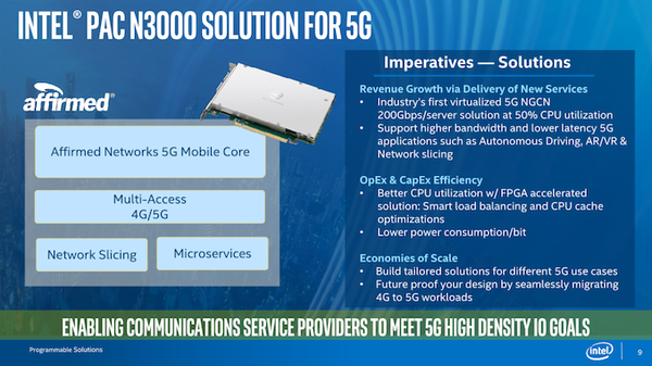 在2月底的移动世界大会(MWC2019)期间,英特尔推出了一款名为FPGAPACN3000的网卡,英特尔希望为网络运营商提供解决其5G网络需求的快速解决方案,带来比竞争对手更优秀的部署时间和灵活性优势。所以这款网卡是直接面向电信运营商的PAC解决方案,新产品能够实现比软件加速更高的吞吐量和更优秀的灵活性,能够让客户快速、轻松地完成部署。