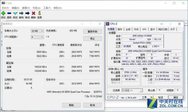 压缩测试中,同样是AMD速龙X4860K平台得分更高