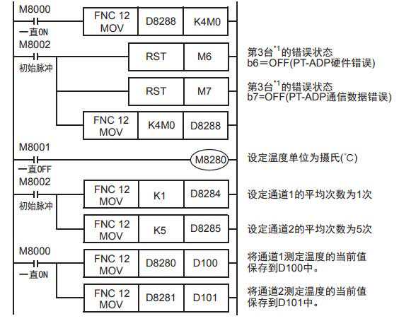 下面的程序是将第3台的通道1、通道2的测定温度(℃)分别保存到D100、D101中。平均次数设定为通道1是1次(即时值),通道2是5次。