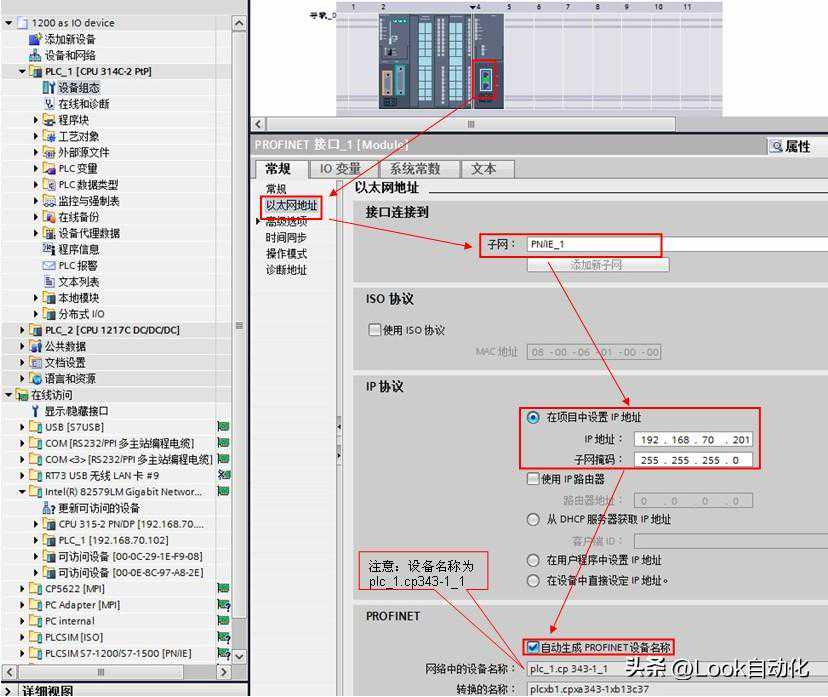 1.1使用Step7V14创建S7-300站使用STEP7V14创建一个新项目,并通过“添加新设备”组态S7-300站PLC_1,选择CPU314C-2ptp,添加CP343-1,设置IP地址。如图1所示。