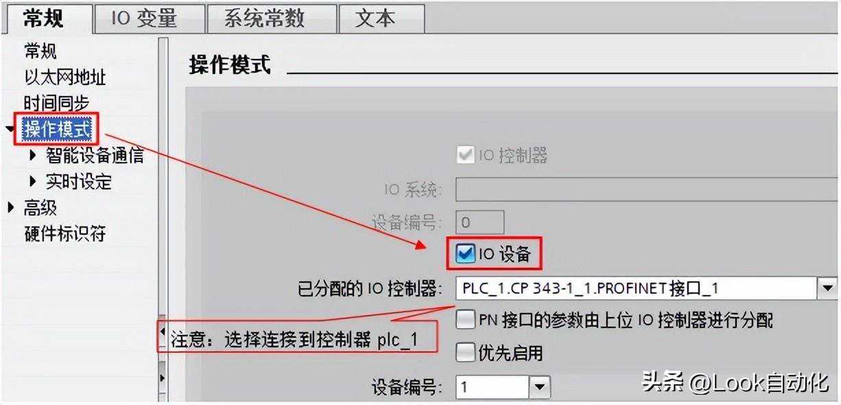 S7-1500作为IO设备,需要将其操作模式设置为IO设备,并将IO设备分配给控制器PLC_1。如图4所示。