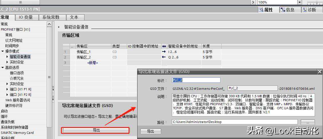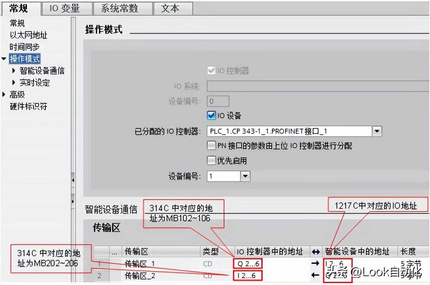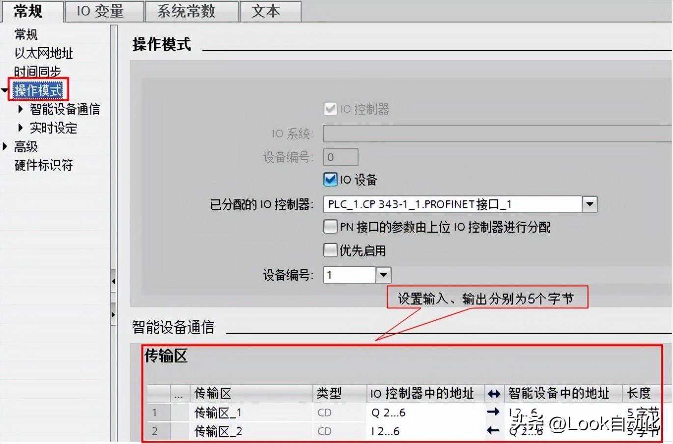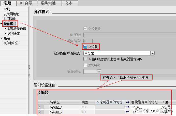 接着,在“智能设备通信”的“传输区”创建IO通信区,控制器将传输5个字节到IO设备的IB2~6;IO设备将QB2~6共计5个字节传送给控制器。