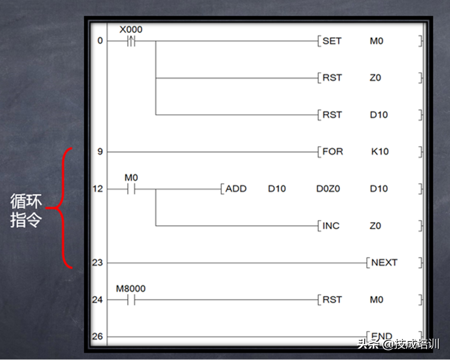 程序的0到9步,触发X0的上升沿信号,把M0导通,Z0、D10全部清空;第9到23步,是一段循环指令,FORK10表示这段程序循环10遍。