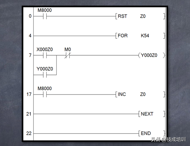 每次进行扫描都会先把Z0清0,然后进入循环(54次),第一遍Z0=0,这时X000Z0的地址是X000,Y000Z0的地址是Y000,X000触发Y000线圈并形成自锁,通过INC指令Z0自加1;第二遍,Z0等于1,这时X000Z0的地址是X001,Y000Z0的地址是Y001,X001触发Y001线圈并形成自锁,通过INC指令Z0自加1;……